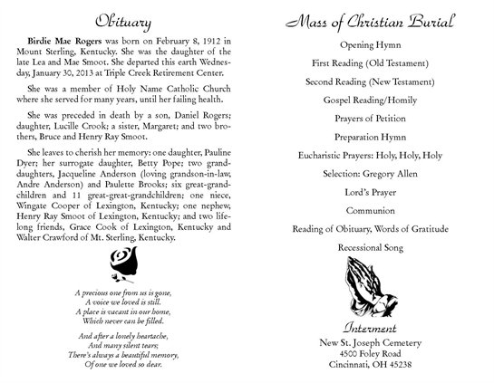 Birdie Mae Rogers was born on February 8, 1912 in Mount Sterling, Kentucky. She was the daughter of the late Lea and Mae Smoot. She departed this earth Wednesday, January 30, 2013 at Triple Creek Retirement Center. She was a member of Holy Name Catholic Church where she served for many years, until her failingContinue Reading